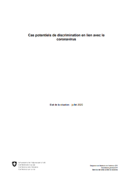 Le document de travail « Cas potentiels de discrimination en lien avec le coronavirus » rassemble divers problèmes possibles, pressentis ou déjà identifiés survenant dans le domaine de la discrimination (raciale) et de la protection des droits fondamentaux en relation avec la crise du coronavirus et les mesures mises en œuvre pour enrayer la pandémie. Il porte une attention particulière aux groupes de personnes qui se trouvaient déjà dans des situations précaires avant la crise du coronavirus et qui risquent, en raison de cette dernière, d’être davantage marginalisés.