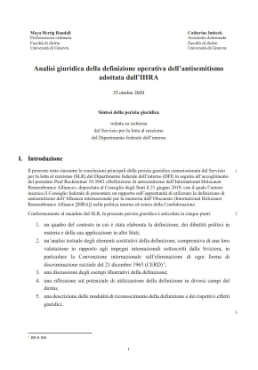 Un'analisi giuridica del 2021 analizza la definizione operativa di antisemitismo adottata dall'International Holocaust Remembrance Alliance (IHRA). Il rapporto è stato commissionato dal gruppo di lavoro che ha preparato il rapporto del Consiglio federale in risposta al postulato 19.3942 del Membro del Consiglio degli Stati Paul Rechsteiner «Definizione di antisemitismo dell'International Holocaust Remembrance Alliance (IHRA).»