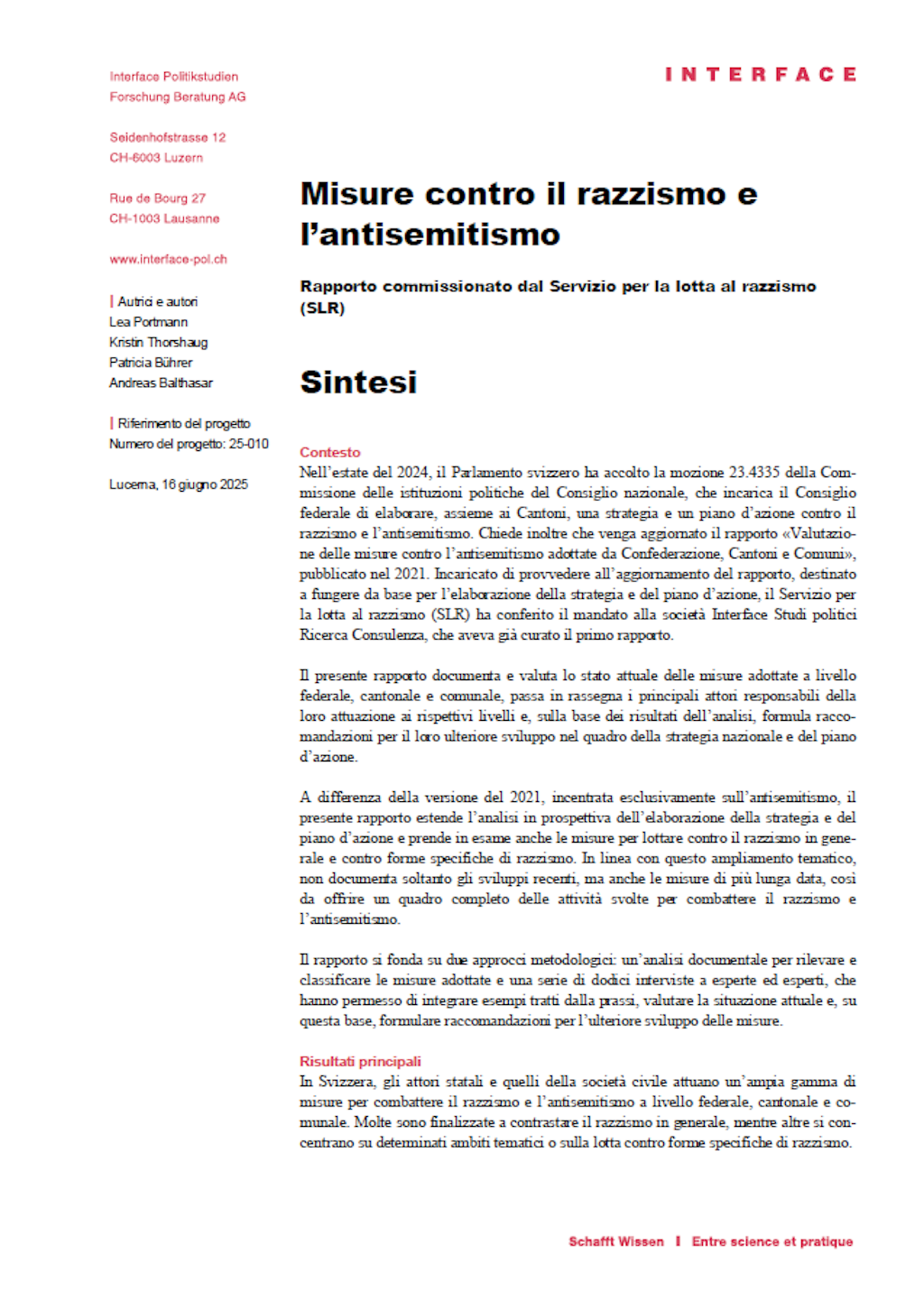 Il rapporto, elaborato in adempimento della mozione 23.4335, è un aggiornamento del rapporto «Valutazione delle misure contro l’antisemitismo adottate da Confederazione, Cantoni e Comuni» pubblicato nel 2021 e analizza le misure messe in atto ai diversi livelli istituzionali per contrastare non più soltanto l’antisemitismo, ma anche il razzismo. La pubblicazione funge da base per l’elaborazione della strategia e del relativo piano d’azione.